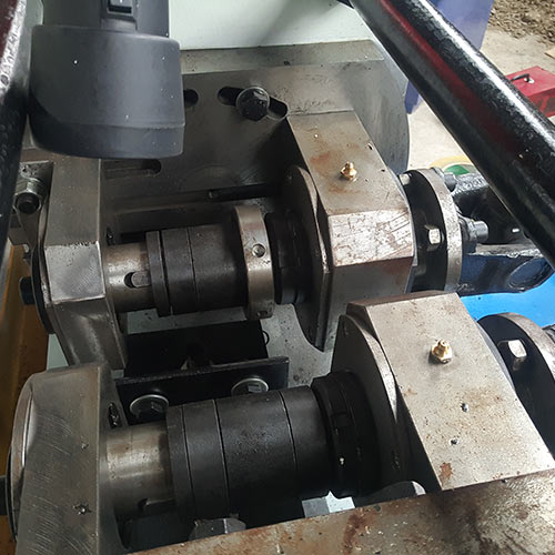 本機的兩主軸中心距調(diào)整為兩主軸座分別對中心調(diào)整,即工件滾壓時處于機器中心位置,對滾壓長工件并穿過機器較為方面。主軸軸線對臺面的夾角可在±3°間調(diào)整,滾壓時工件每轉軸向進給量